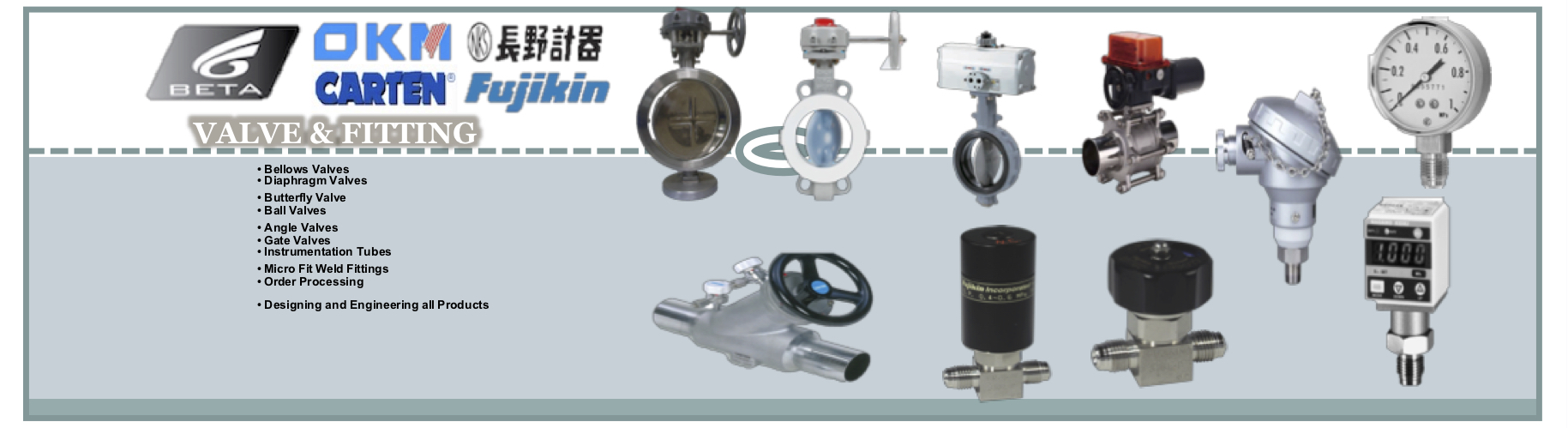 高純不銹鋼EP、BA/MP、AP等級管子/管道/管件;高純不銹鋼隔膜閥、波紋管閥、蝶閥、球閥、針閥、調(diào)壓閥等等;超純VCR、焊接、卡套接頭;以及設(shè)備應(yīng)用材料:壓力傳感器、壓力表、鋼瓶電子稱、火焰探測器、氣體探測器、鋼瓶緊急切斷裝置、加熱毯、加熱線、PTFE保溫纏繞帶;化學品供應(yīng)系統(tǒng)中的PFA閥門以及括口和焊接接頭,不銹鋼內(nèi)襯PFA/PTFE管道、閥門、接頭等配件。